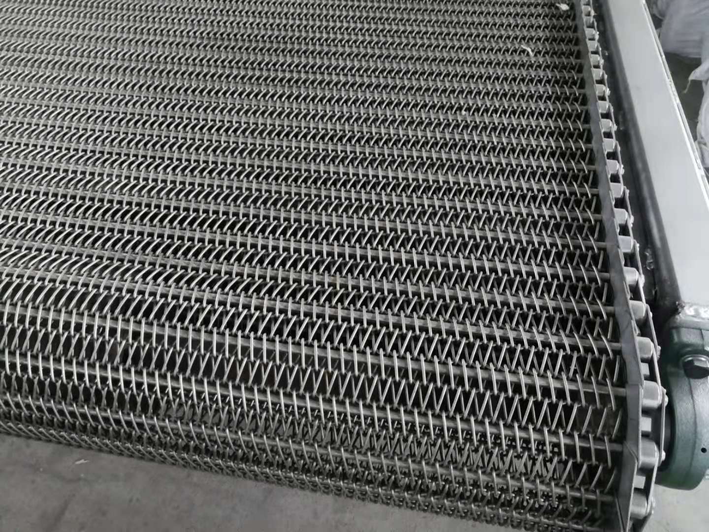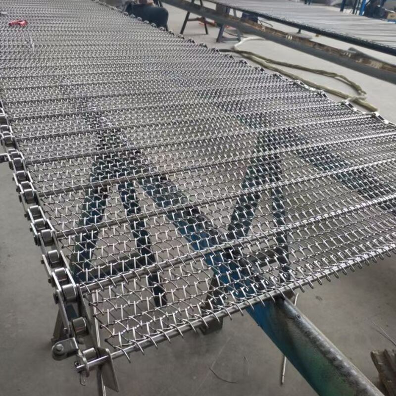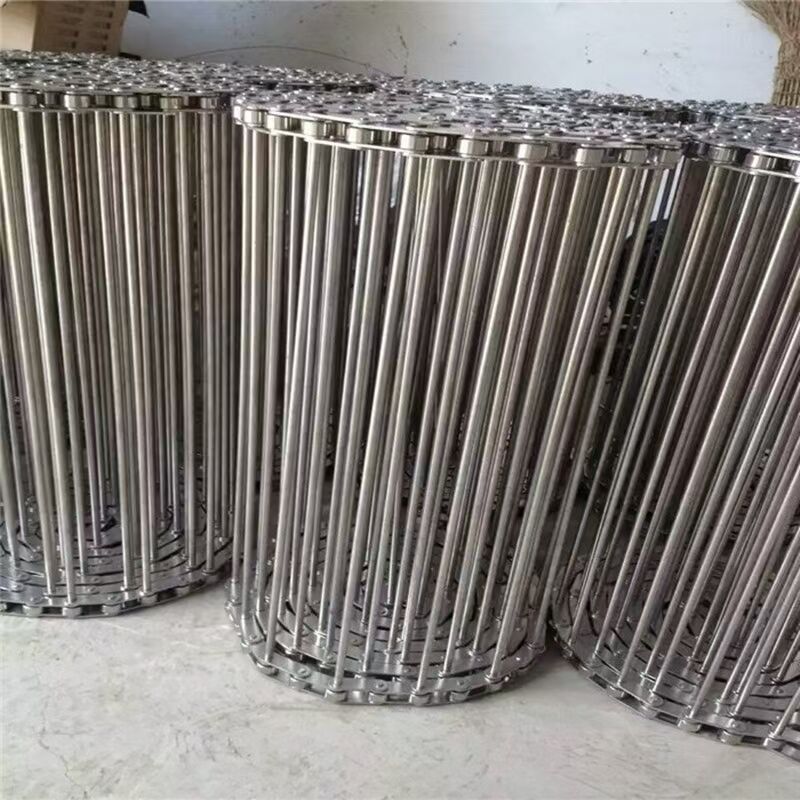 不锈钢输送网带采用链条传动方式,网带两侧加链条,网带中间穿串杆,串杆套在链条上,串杆端部打孔,开口销固定,拆卸方便,或者串杆端部加垫片焊接,这样链条通过链轮驱动拉着串杆,串杆带着网带传动。这样的网带要求网带节距和链条节距配合精密准确,使传送网带运行过程中顺畅,不会拱起来,从而有效输送物料。